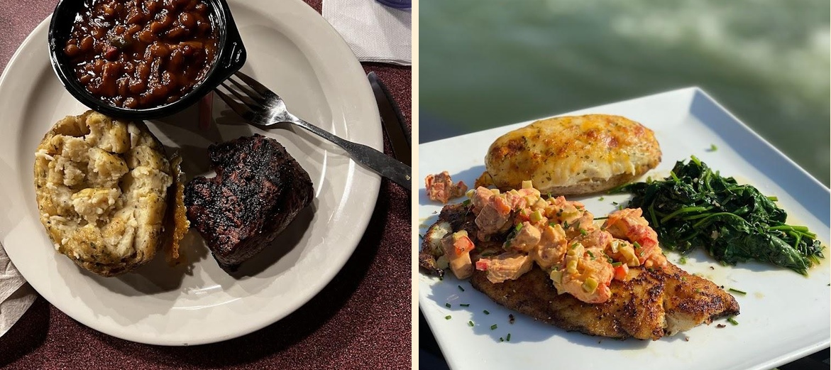 The River & Sandbar specializes in American grilled dishes, local specialties, and simple traditional fare. The restaurant has a diverse menu with options like seafood, steaks, burgers, and desserts.